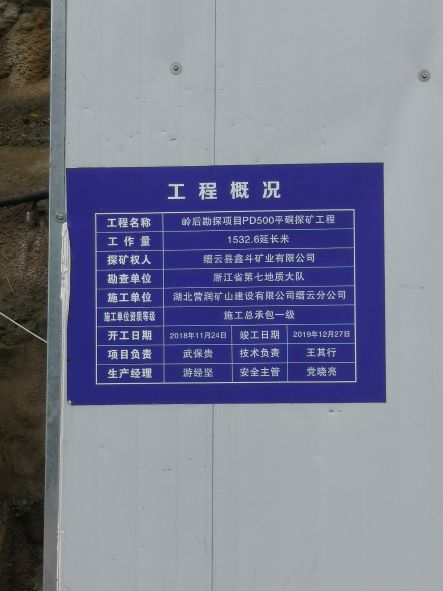 縉云縣鑫斗礦業(yè)有限公司是一家有限責任公司,成立于2007年8月7日,法定代表人:張圣,經(jīng)營范圍:螢石(普通)地下開采;螢石礦勘探;螢石及螢石工藝品加工、銷售。 礦山新建項目名稱為浙江省縉云縣大源鎮(zhèn)嶺后螢石礦,擬建生產(chǎn)規(guī)模15萬噸/年。該礦山項目探礦權于2005年9月首次設立,委托浙江省第七地質大隊組織實施。最新核發(fā)的探礦權證有效期限為2020年05月26日至2022年05月26日,勘查范圍由22個拐點組成。